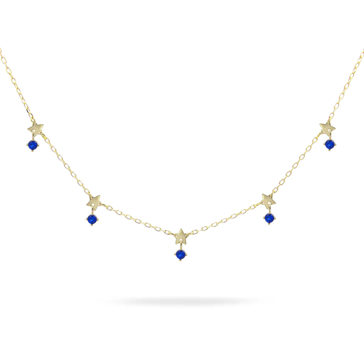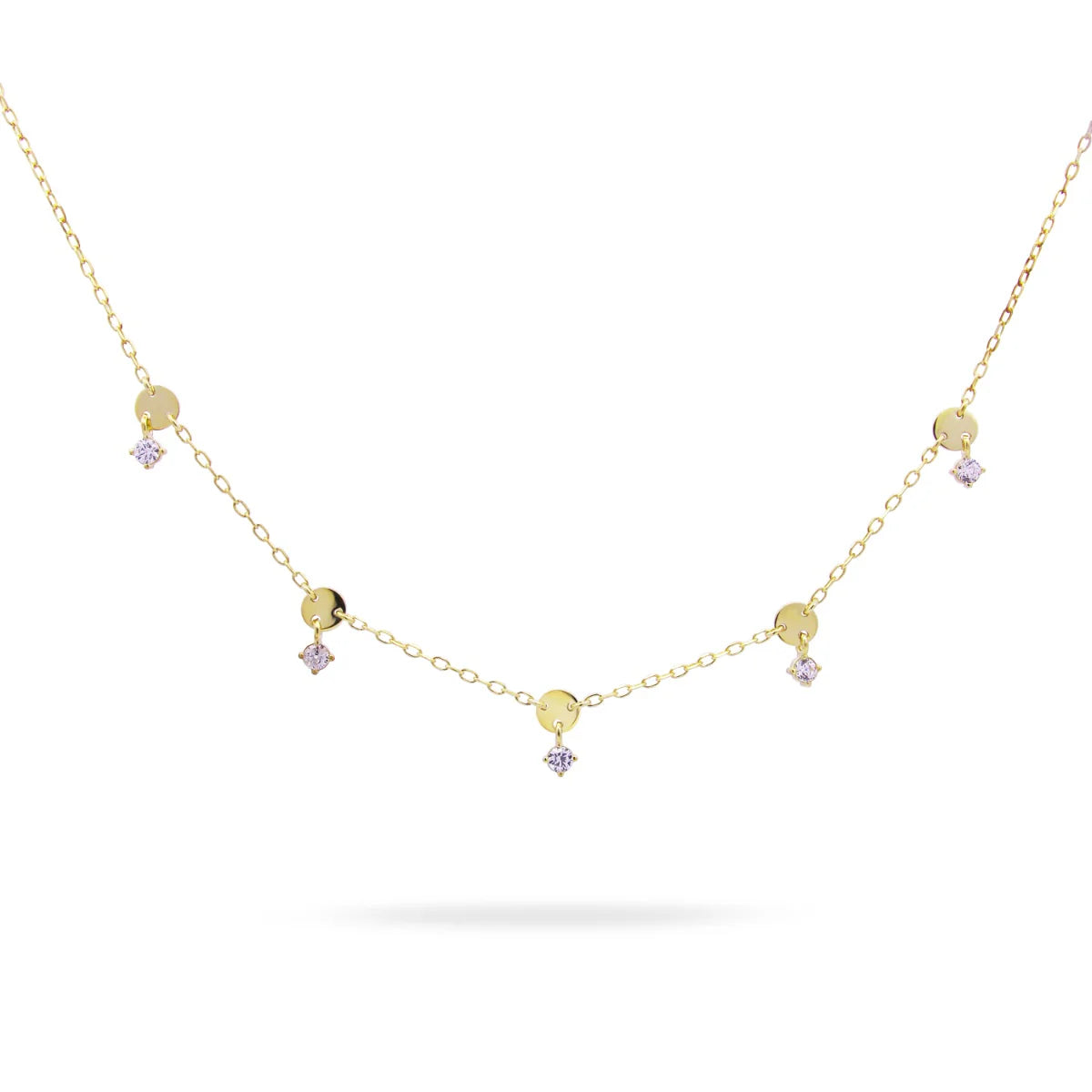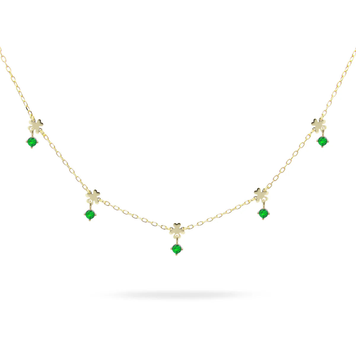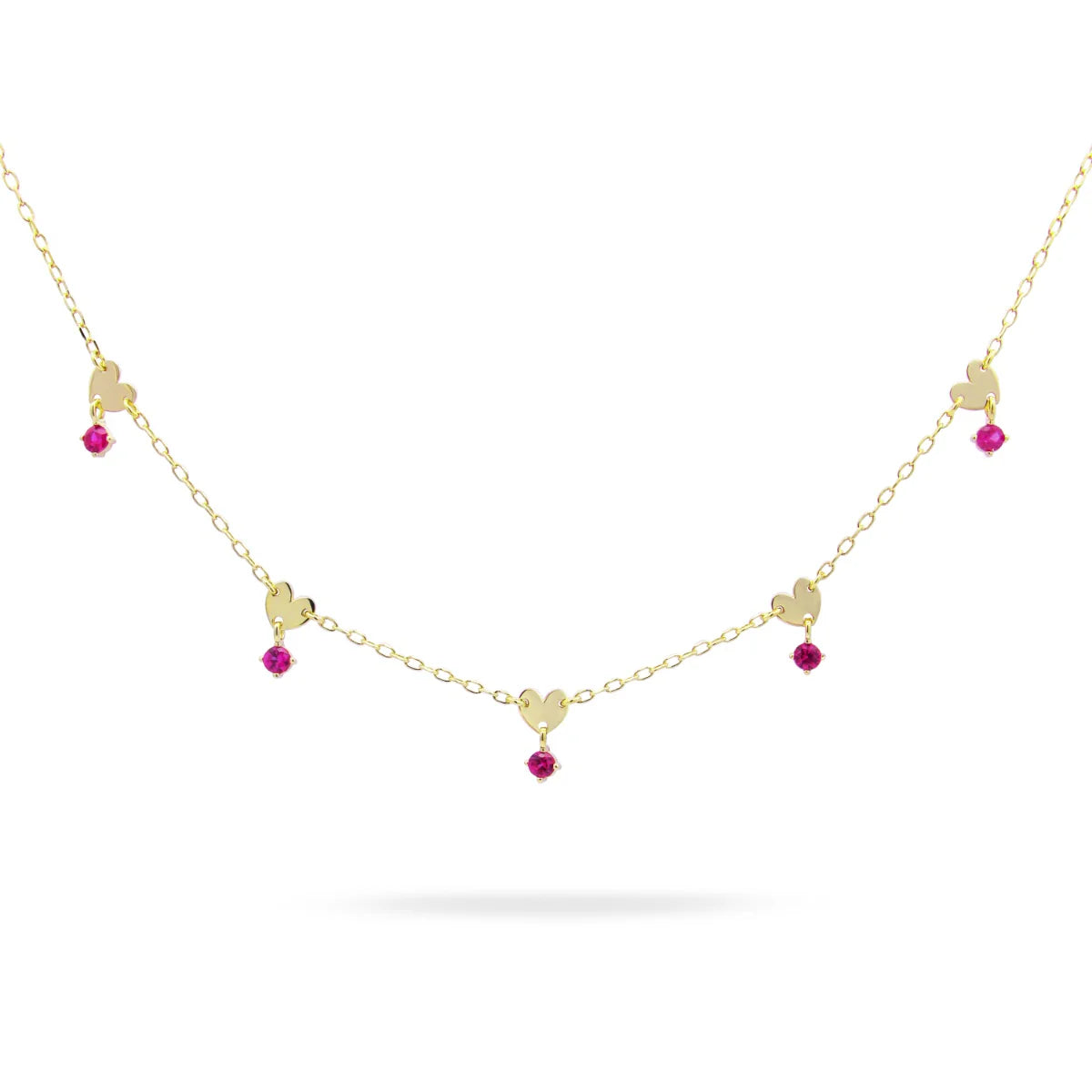 Girocollo con 5 cuori a lastra e castoni pendenti con zirconi rossi, o 5 stelle con zirconi blu, o 5 quadrifogli con zirconi verdi, o 5 tondi con zirconi bianchi.