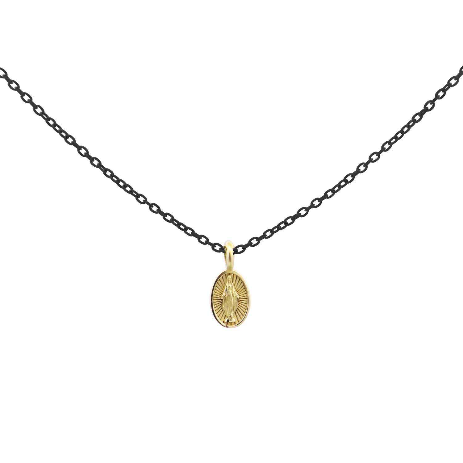 Soggetto: madonnina Colore: nero Lunghezza: 38 cm + 4 cm estensione Materiale: Oro 18KT, base catena argento 925 Nichel free Fatto in Italia, con amore