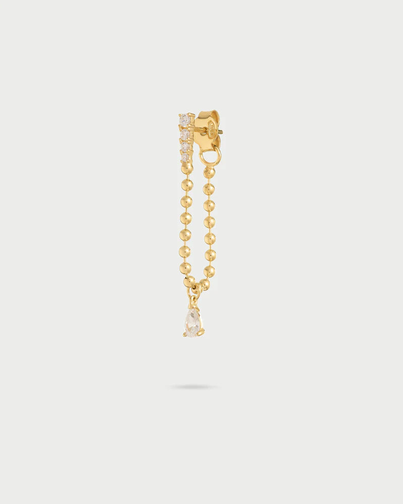 Questo orecchino è composto da una catena di piccole sfere che ritorna e si aggancia dietro il lobo. In basso un pendente fatto a goccia in zircone