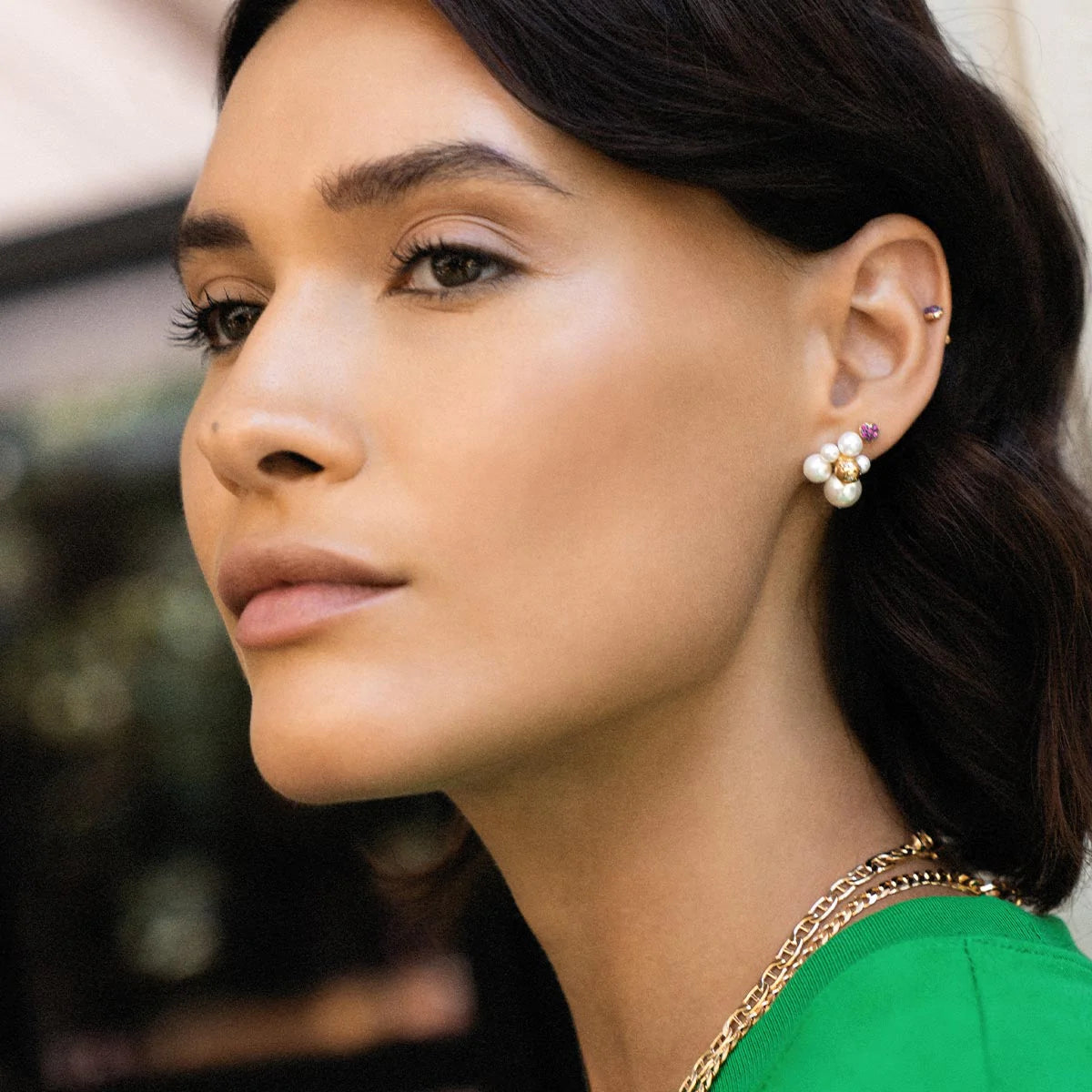 Coppia di orecchini con mini sfera starball nel centro e grappolo di perle di conchiglia a lobo.