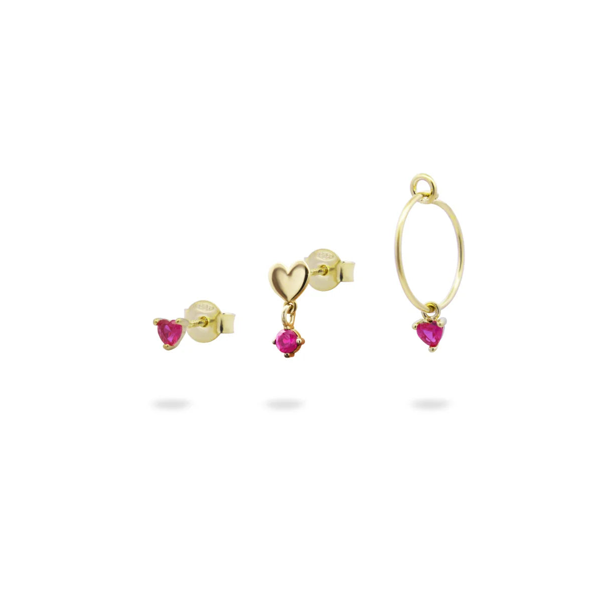 Set di orecchini composto da un cerchietto con castone pendente, un orecchino a lobo a forma di cuore e castone pendente in zircone rosso e un orecchino a lobo con cuore tappabuco in zircone rosso