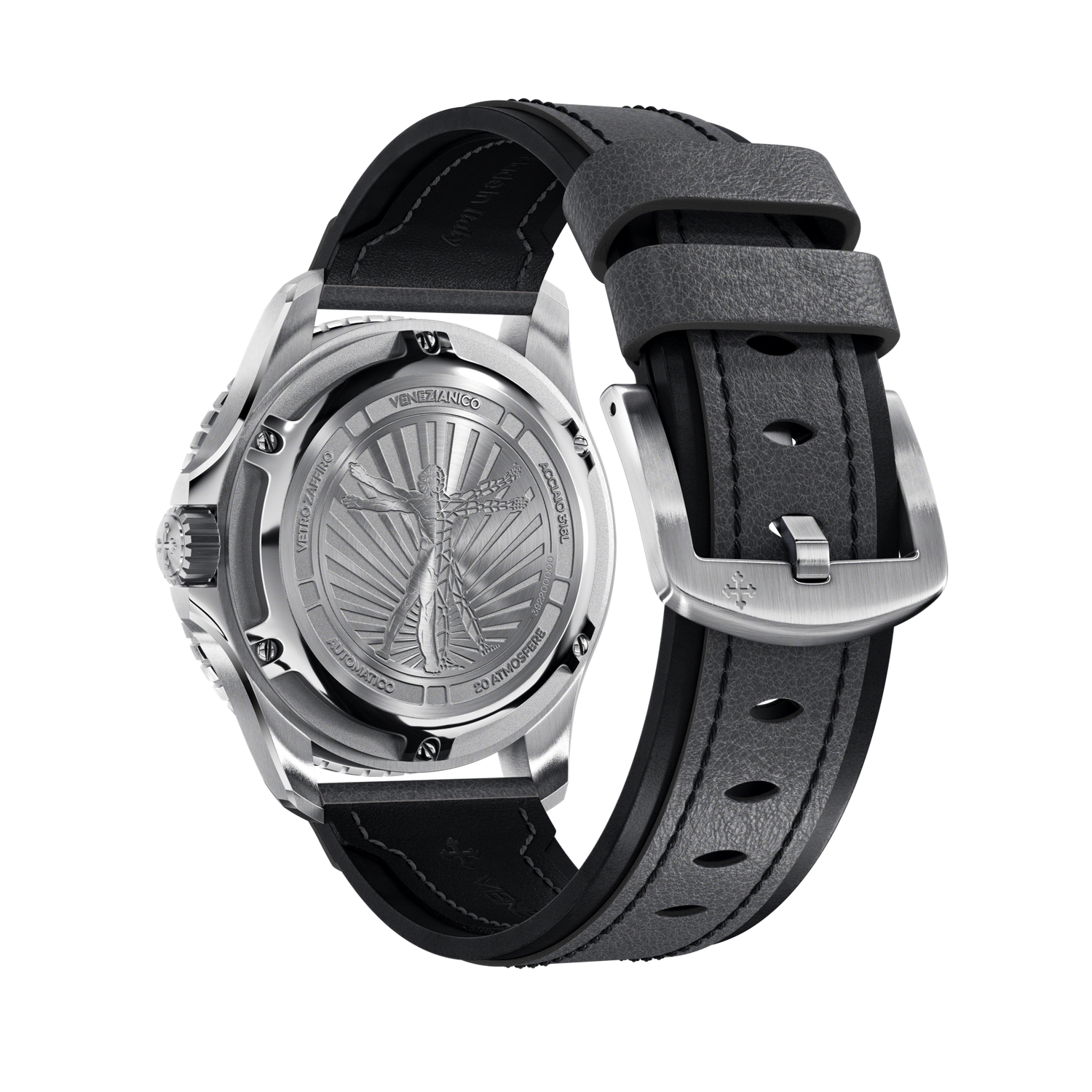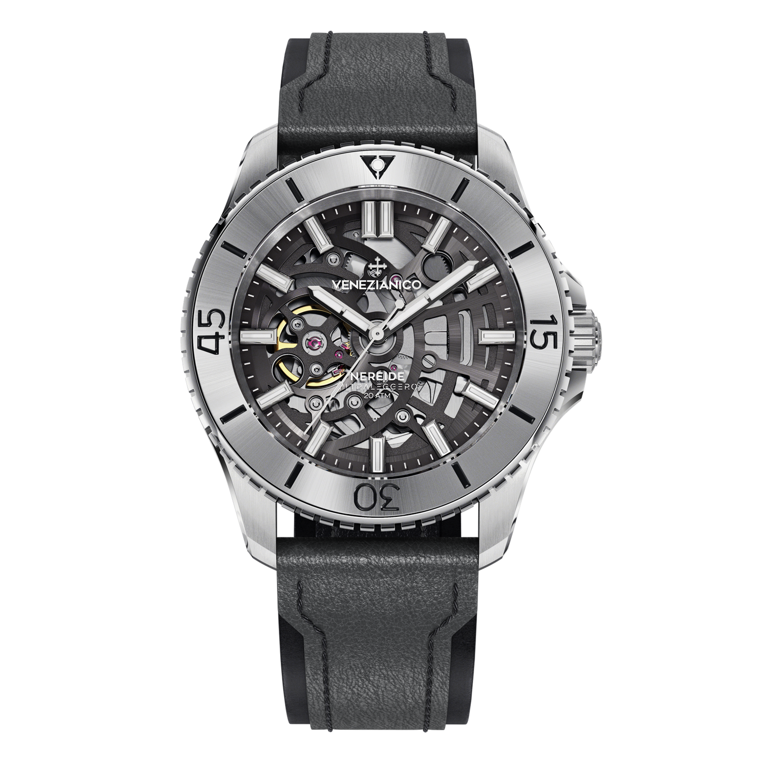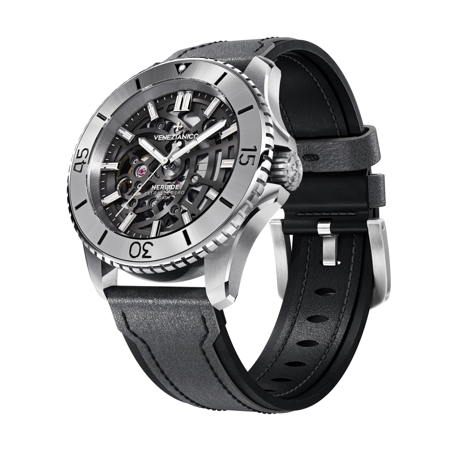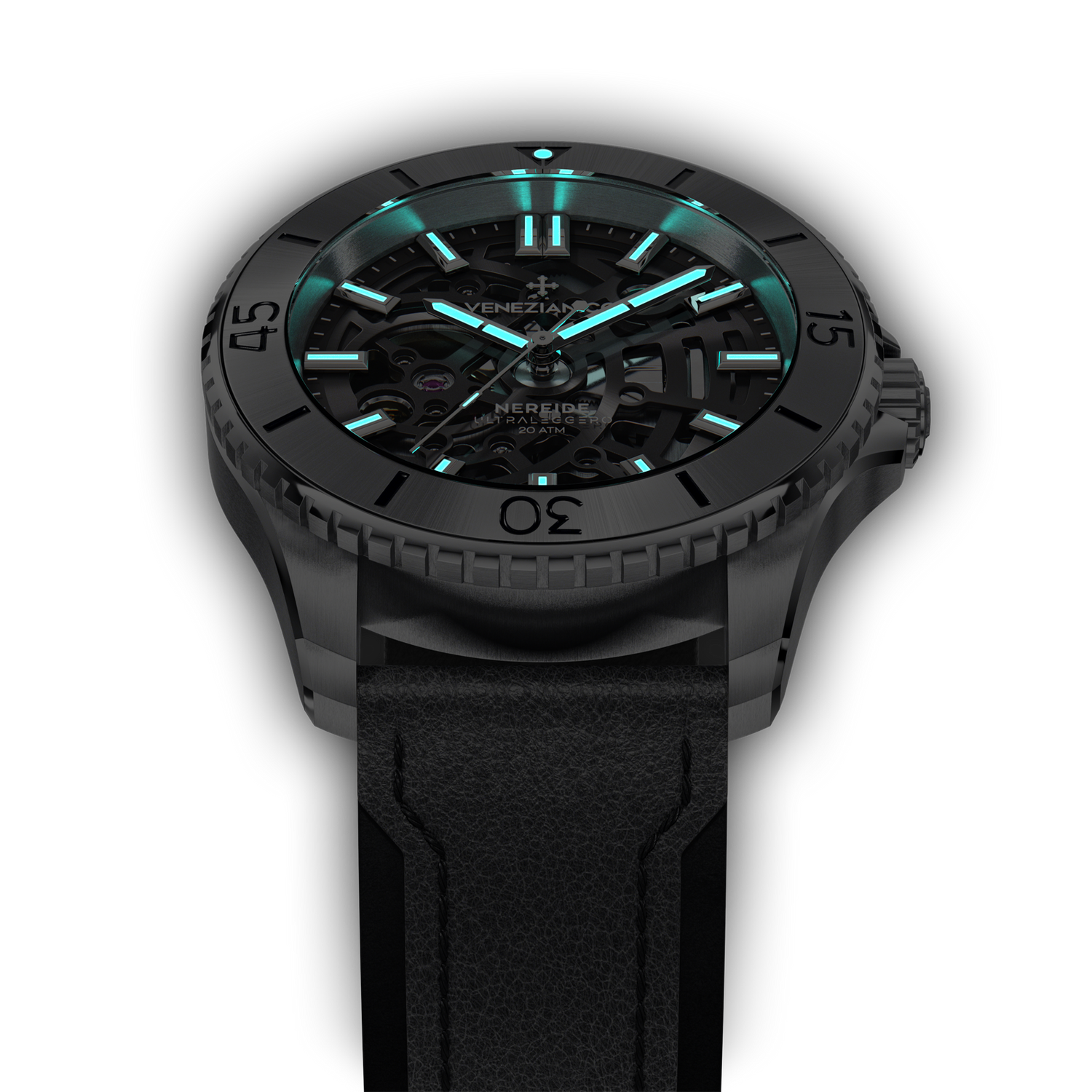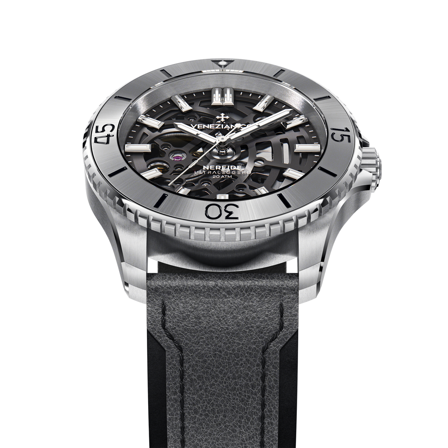 Ultraleggero è l’orologio più innovativo della serie Nereide e si ispira all’Uomo Vitruviano, simbolo del Rinascimento e della fine della contrapposizione tra arte e scienza. La singolare geometria del quadrante scheletrato si integra perfettamente con il corpo del movimento, attraverso un’originale soluzione costruttiva brevettata che consente maggior leggerezza e minore ingombro.